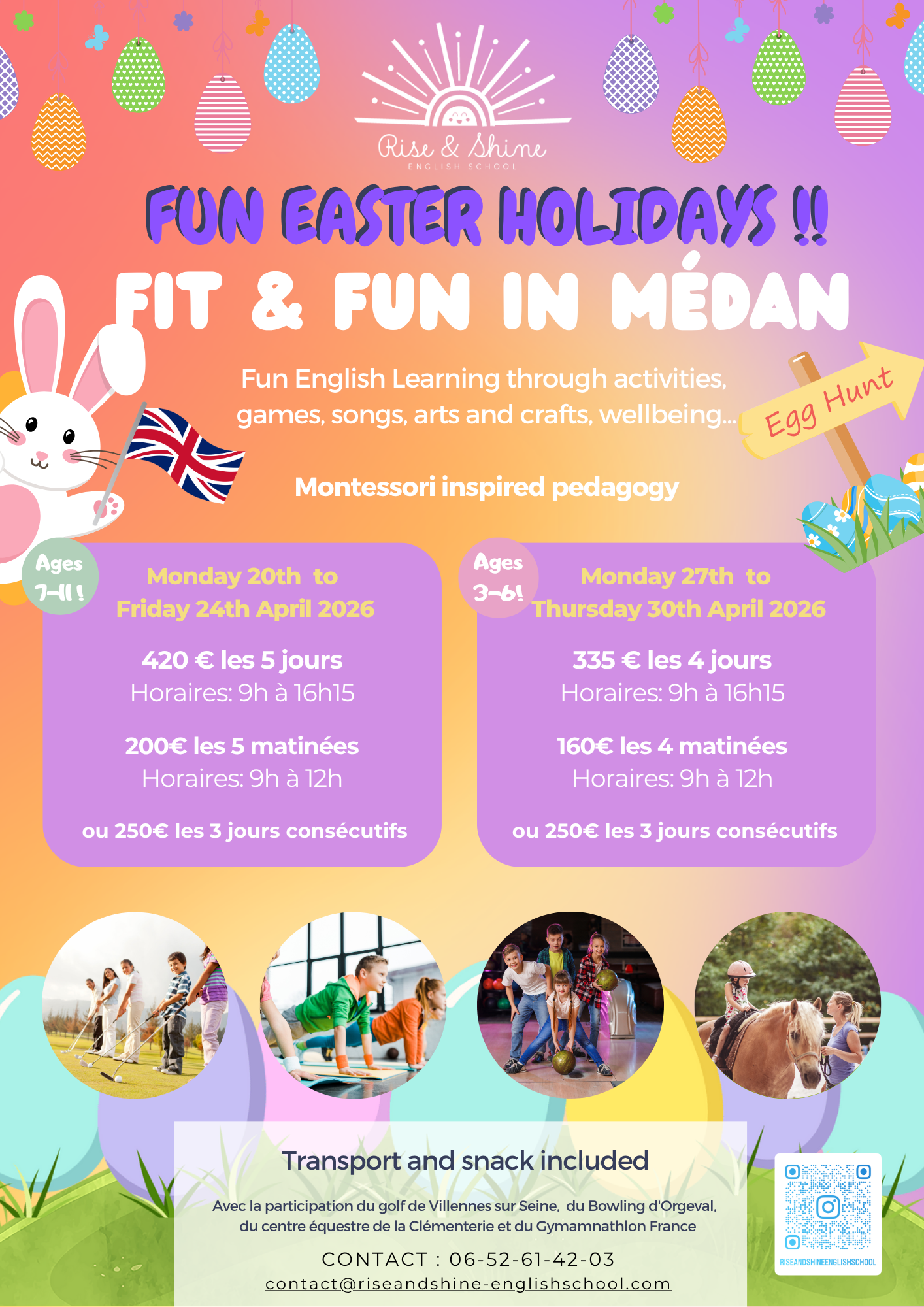 🌸 Fun Easter Holidays – Fit & FunDu lundi 20 au vendredi 24 avril 2026 et du Lundi 27 au Jeudi 30 avril 2026 Rise & Shine propose à Médan une semaine spéciale vacances de printemps placée sous le signe du mouvement, de la créativité et de l’anglais ! Et du lundi 20 au vendredi 24 avril 2026, également à la salle Chavagnac de Davron Organisé à, ce stage immersif permet aux enfants de pratiquer l’anglais de manière naturelle et vivante à travers : Le programme s’appuie sur une pédagogie inspirée de la méthode Montessori, favorisant l’autonomie, la confiance en soi et l’apprentissage par l’expérience. Inscriptions avant le 12 avril 🕘 Horaires & Tarifs Formule semaine complète :425 € la semaineHoraires : 9h à 16h15 Formule matinées :200 € les 5 matinées (9h–12h)ou250 € les 3 jours consécutifs