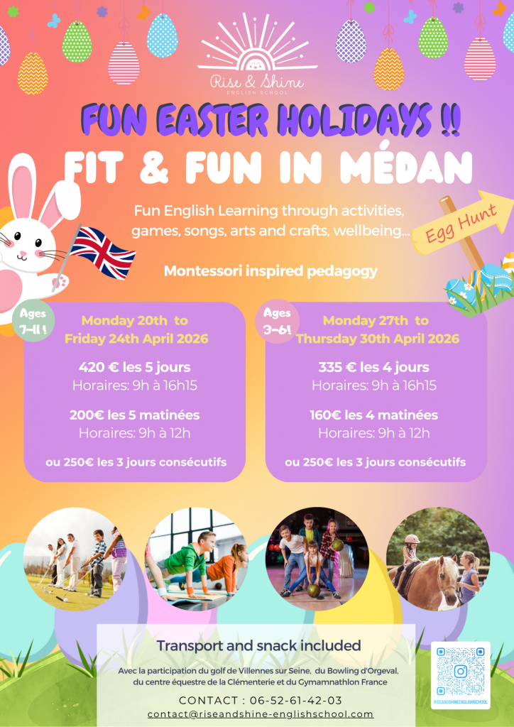 Du lundi 20 au vendredi 24 avril 2026 et du Lundi 27 au Jeudi 30 avril 2026 Rise & Shine propose à Médan une semaine spéciale vacances de printemps placée sous le signe du mouvement, de la créativité et de l’anglais !
